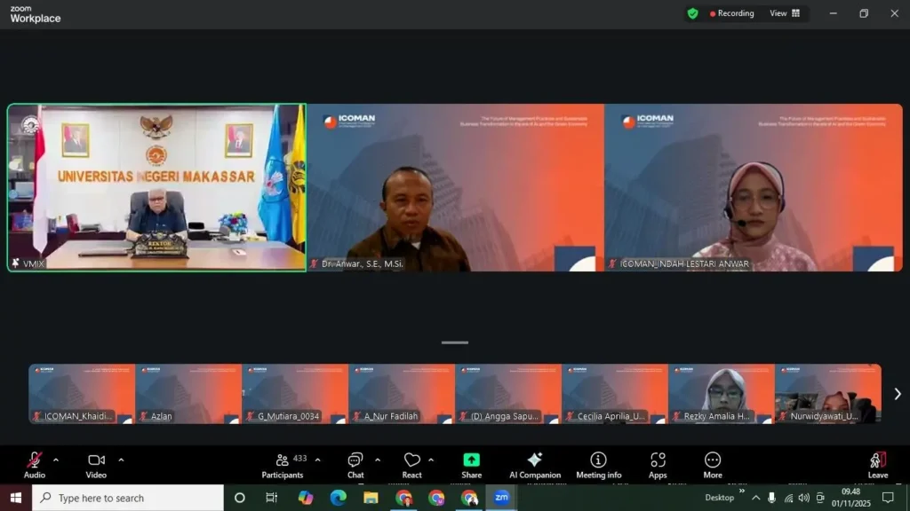 Makassar – Program Studi Manajemen Fakultas Ekonomi dan Bisnis Universitas Negeri Makassar (FEB UNM) kembali memperlihatkan komitmen akademiknya di tingkat global melalui penyelenggaraan International Conference on Management (ICOMAN) 2025. Konferensi internasional tersebut berlangsung pada Sabtu (1/11/2025) secara daring melalui platform Zoom Meeting dan sukses menarik perhatian para akademisi serta praktisi dari berbagai negara.